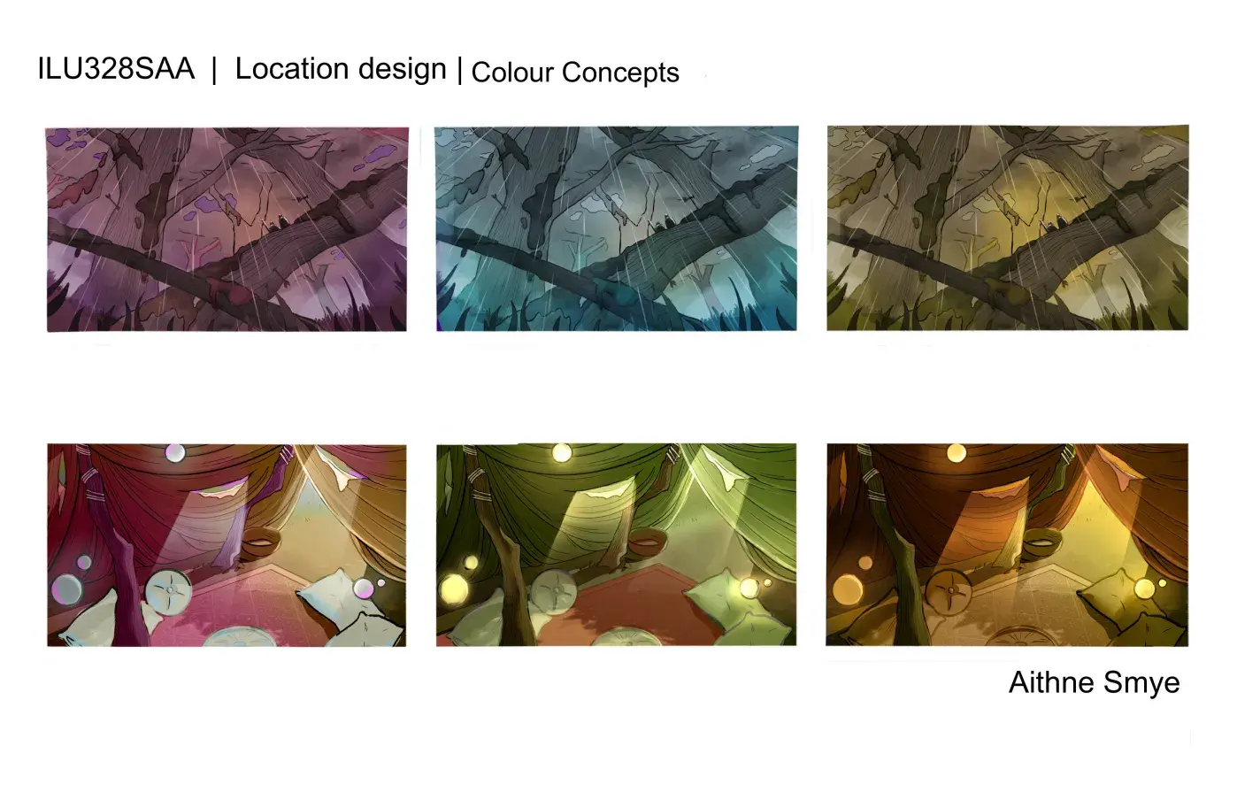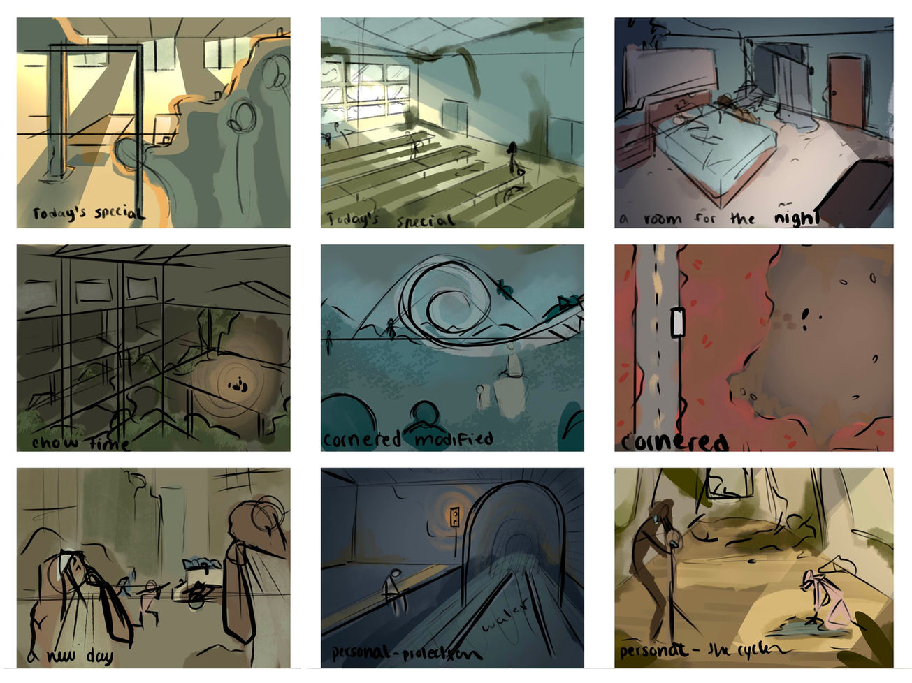 Early practice of visual development in college. I was tasked with designing characters based on shapes and later asked to further develop an environment surrounding the said characters.